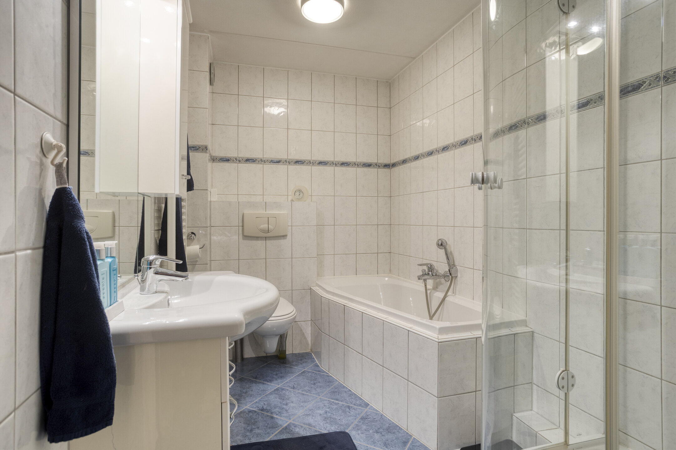 De badkamer is netjes en compleet uitgevoerd met een wastafelmeubel, toilet, douche en een ligbad.