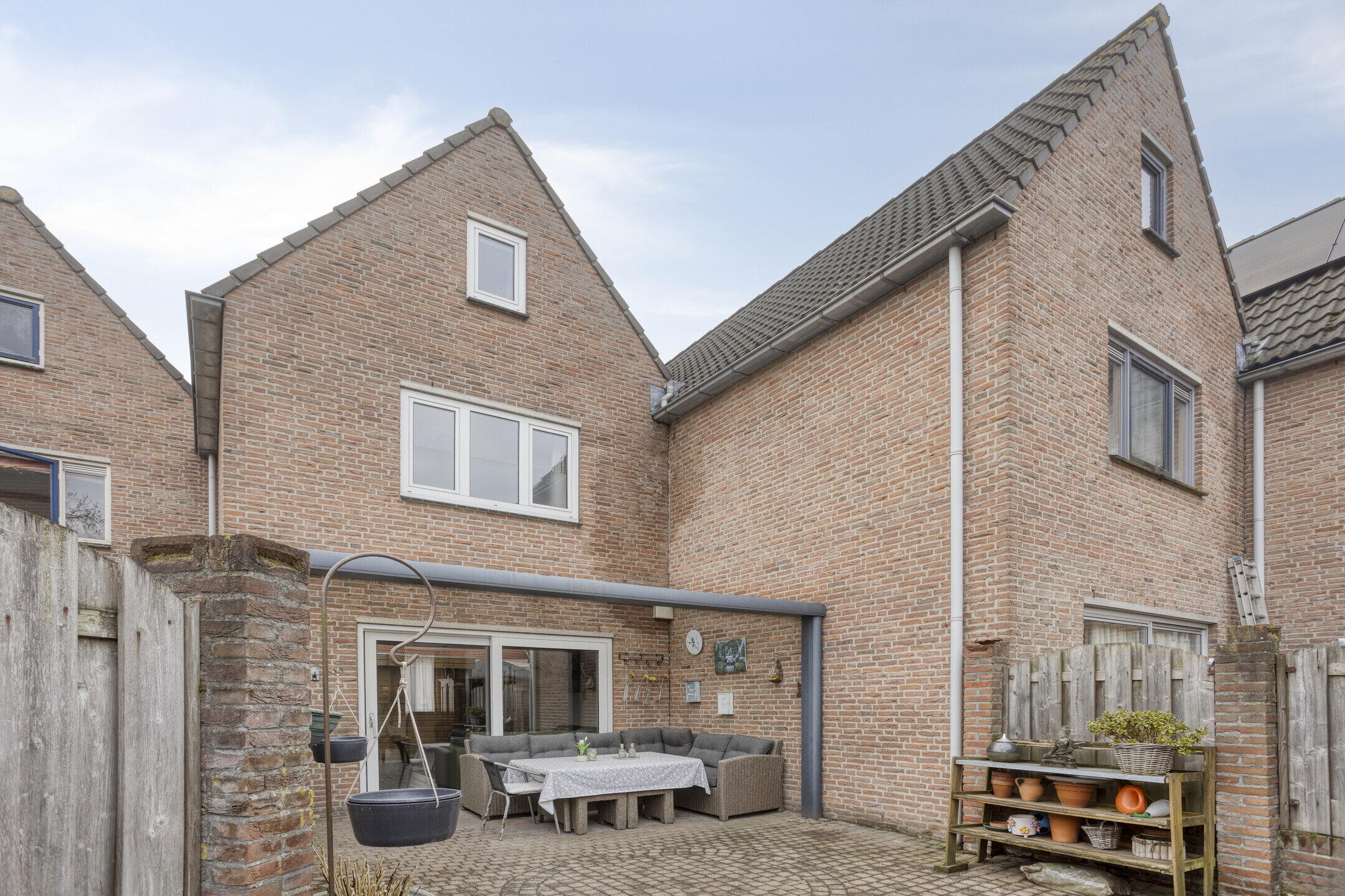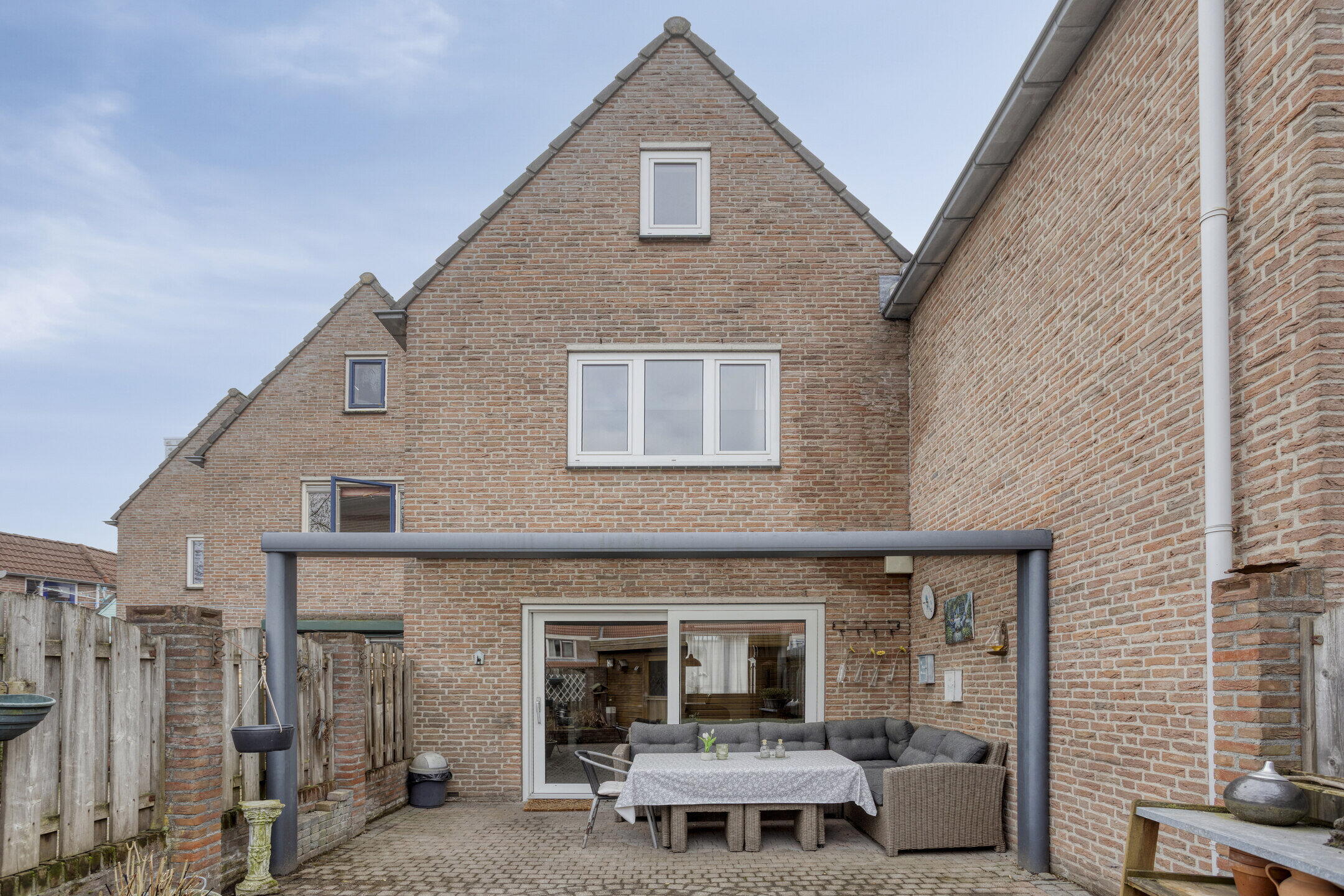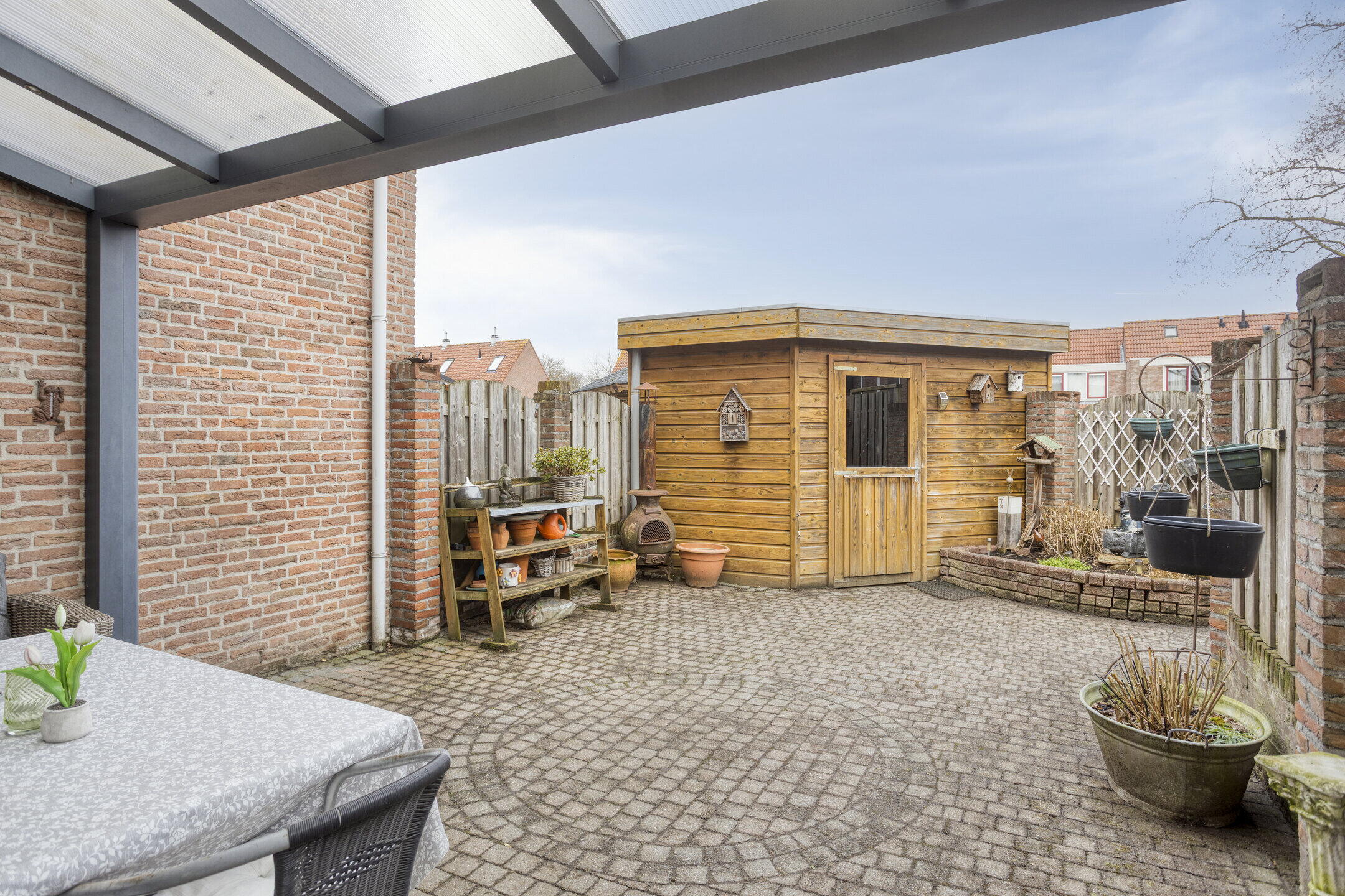 De achtertuin grenst vrij aan een speeltuintje, wat zorgt voor een open en ruimtelijk gevoel. Direct aan de woning bevindt zich een sfeervolle terrasoverkapping. Verder is er een houten berging met elektra en een praktische achterom. Een fijne buitenruimte waar je op verschillende momenten van de dag kunt genieten.